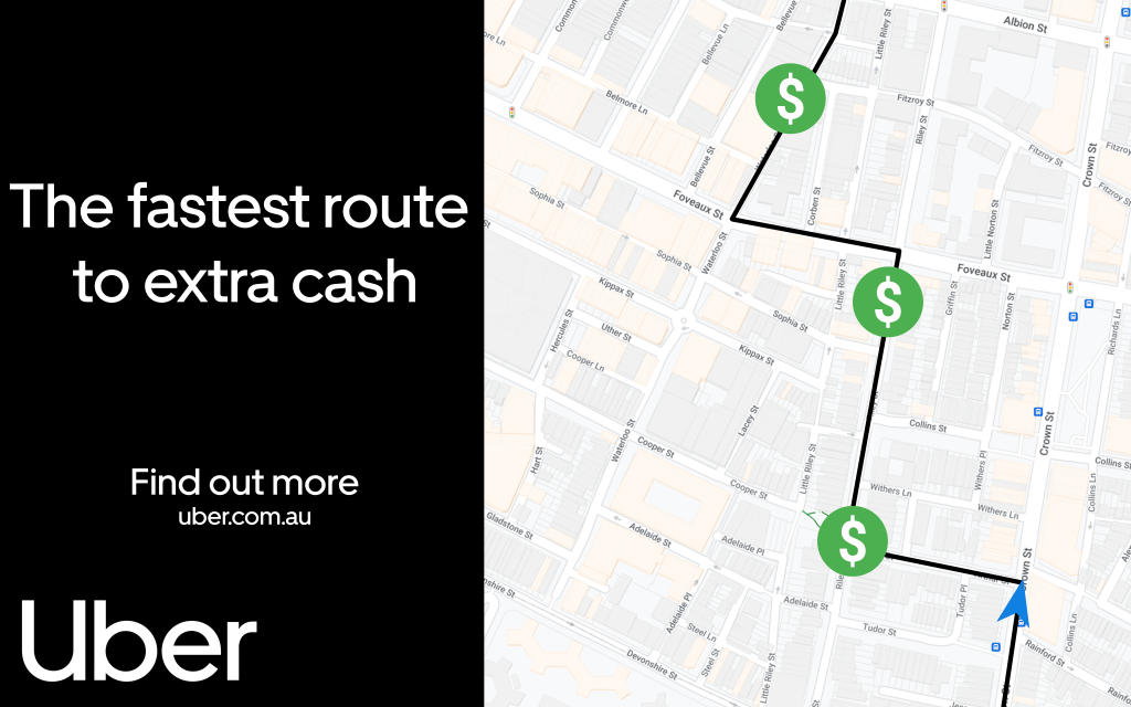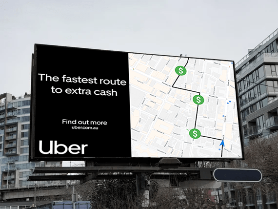 The visual was chosen as it best fit the SMP of turning a car into extra cash. The presentation of a GPS map enroute to various points of “cash” is a representation of how Uber driving works, as well as showcasing how simple of a task it is to earn money if you own a car. Coupled with the headline “the fastest route to extra cash”, it presents the idea that driving for uber is a great and quick way to earn a living or make extra cash on the side for those who own a car. This visual and headline was chosen as it is as simple and quick to understand to any passer-by, as the visual and headline can be recognized if passer-by is moving. A call to action follows the headline, encouraging anyone intrigued to visit the link. Additionally, the logo can help with brand recall.