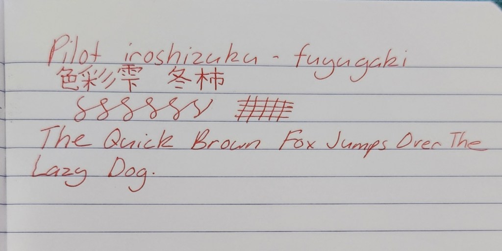 Today’s ink is the Pilot iroshizuku fuyu gaki (色彩雫 冬柿), which translates to winter persimmon. First impressions is that quite a unique colour. It is a nice reddish orange that stands out quite well. The ink matches up with its name, as it quite resembles the colour of a persimmon. The writing experience is nice and smooth, as expected with iroshiziku inks.